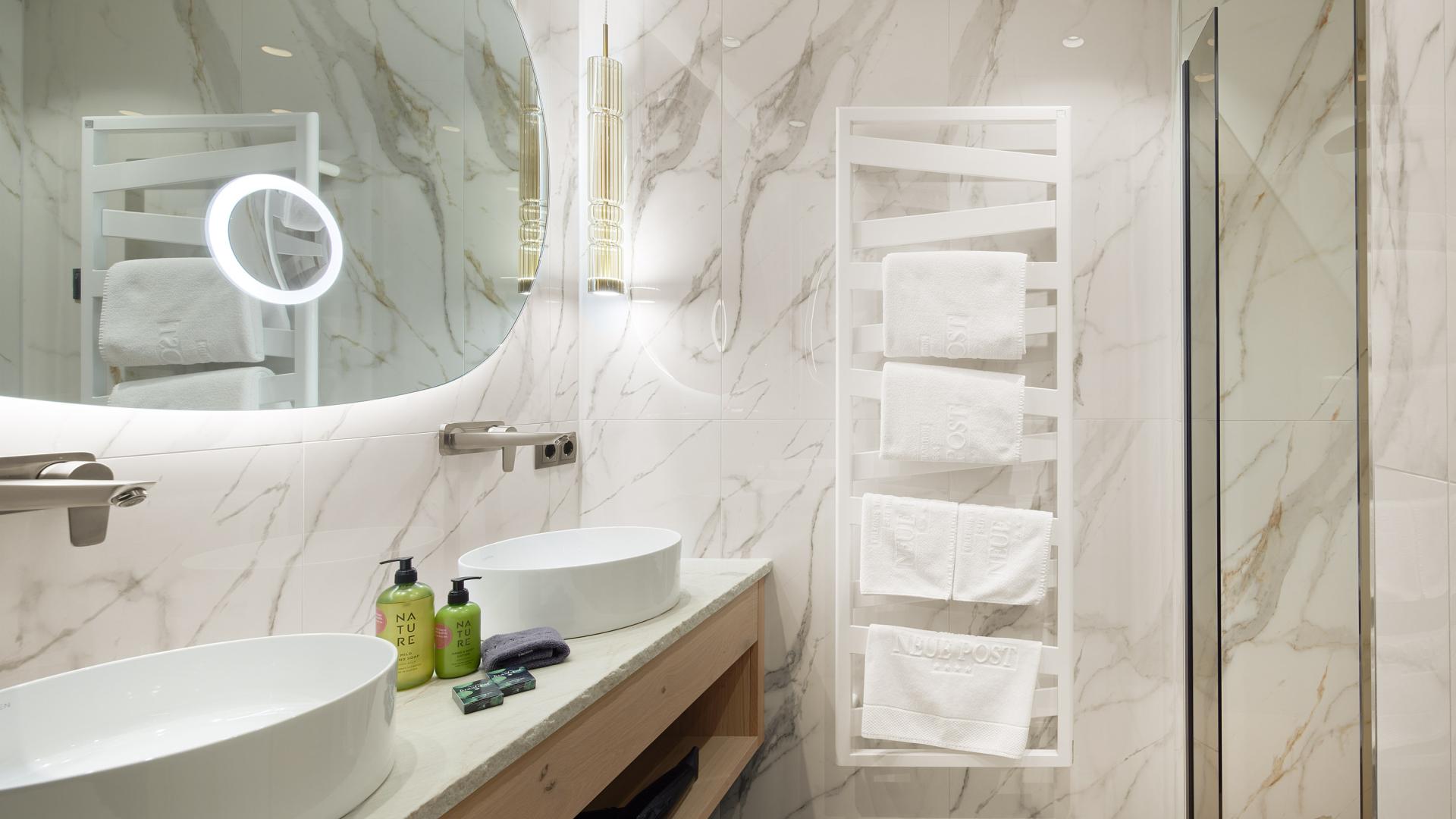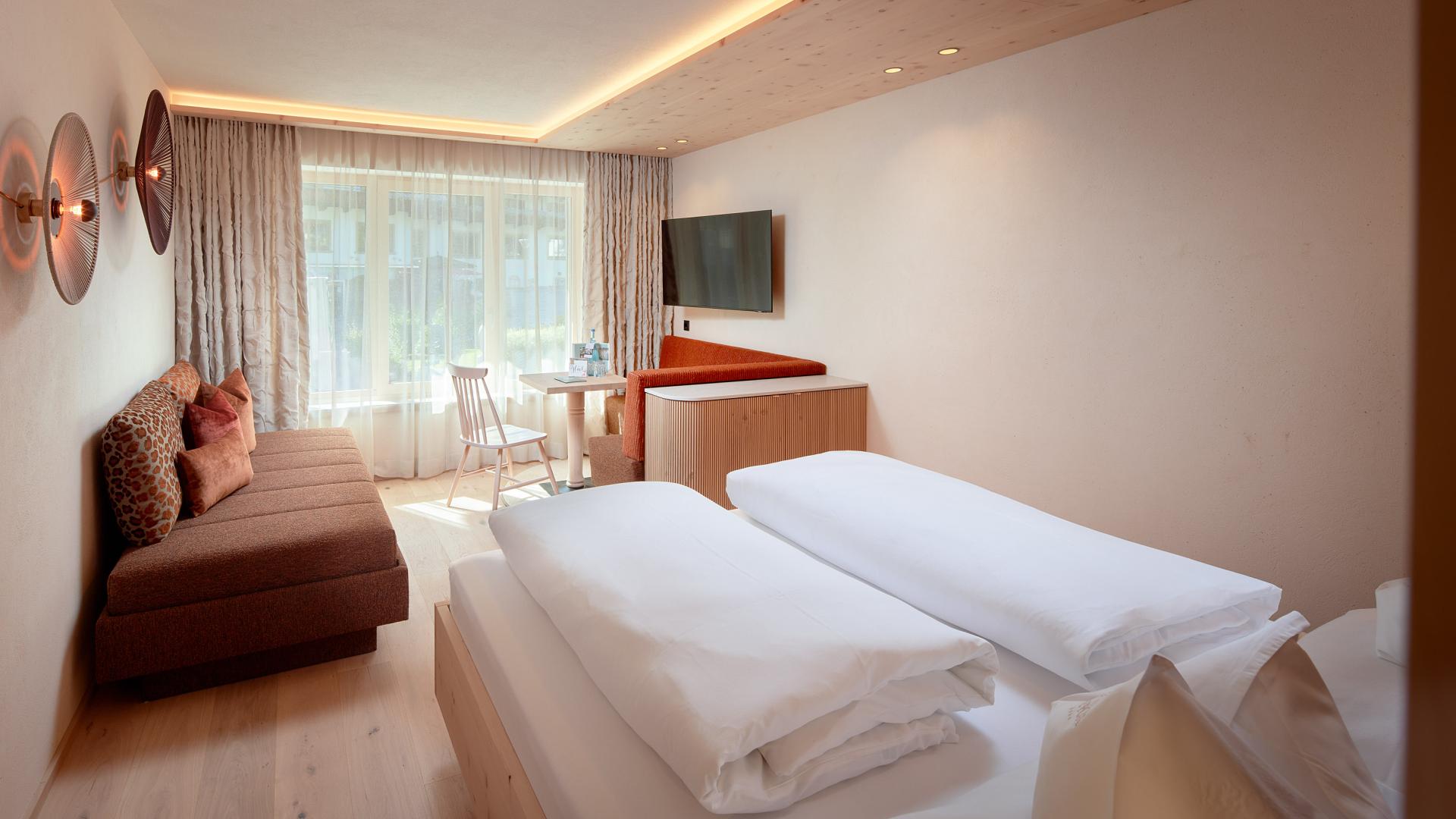 Double bed made of high-quality Zillertal “Zirben” wood with reading, lamp , living area with seating area, sofa bed and TV, cable TV with Sky and radio programmes, telephone and safe, fridge, wooden floor, spacious bathroom with shower, make-up mirror, hairdryer, shampoo and shower gel, separate toilet, bathrobes and slippers, the rooms are located in the main building (south tract), with view to the main street