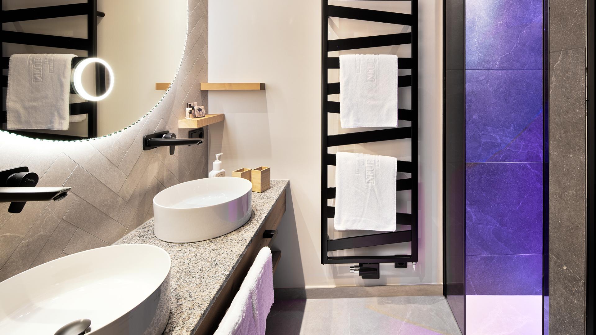 Holzdoppelbett mit Leselampe, durch Schiebetür abtrennbarer Wohnbereich mit Sitzgelegenheit, Schlafcouch und TV, Kabel-TV mit Sky- und Radioprogrammen, Telefon und Safe, Kühlschrank, kombinierter Holz- und Teppichboden, mit Balkon, geräumiges Badezimmer mit Dusche, Kosmetikspiegel, Föhn, Shampoo und Duschgel, separates WC, Bademäntel und Slipper, die Zimmer befinden sich im Haupthaus (Neubau)