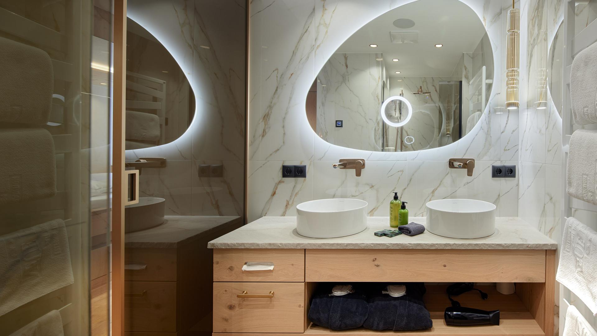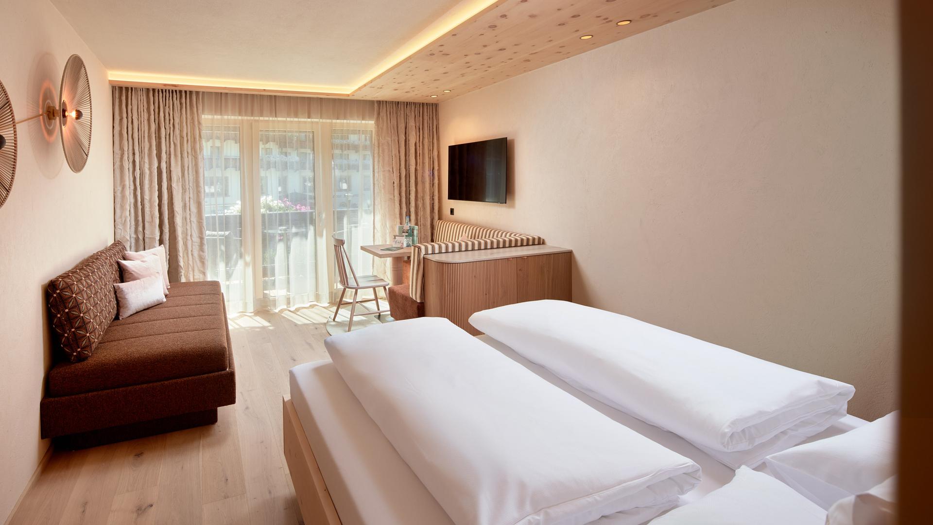 Doppelbett aus hochwertigem Zillertaler Zirbenholz mit Leselampe, Wohnbereich mit Sitzgelegenheit, Schlafcouch und TV, Kabel-TV mit Sky- und Radioprogrammen, Telefon und Safe, Kühlschrank, Holzboden, mit Balkon, geräumiges Badezimmer mit Dusche, Kosmetikspiegel, Föhn,, Shampoo und Duschgel, separates WC, Bademäntel und Slipper, die Zimmer befinden sich im Haupthaus (Süd-Trakt), Blickrichtung Hauptstraße